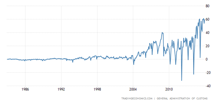 Μ.Ο ισοζυγίου εμπορίου (εξαγωγές-εισαγωγές), 1983-2015: +68.72 δις δολάρια (πλεόνασμα)Ψηλότερη τιμή ισοζυγίου εμπορίου: +606.19 δις δολάρια, Φεβρουάριος 2015.