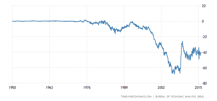 Μ.Ο ισοζυγίου εμπορίου (εξαγωγές-εισαγωγές), 1950-2015: -12875.050 δις δολάρια (έλειμμα)